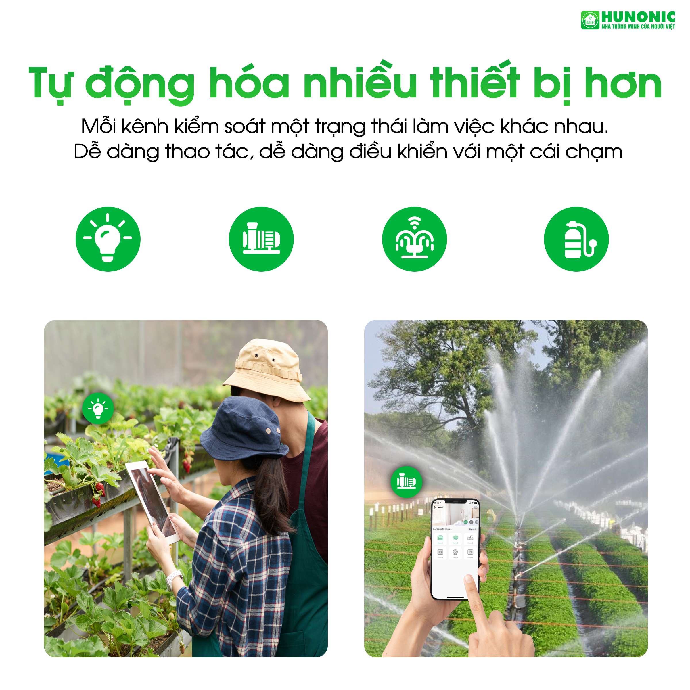 | Thiết lập Ngữ cảnh | Kết hợp với các sản phẩm khác trong hệ sinh thái Hunonic để tạo các kịch bản tự động hóa, ví dụ: "Chế độ về nhà": Bật Kênh 1 (Đèn sân), Bật Kênh 2 (Đèn phòng khách). |