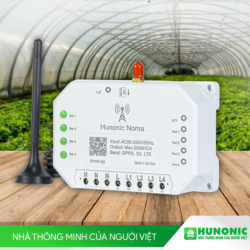 Tóm lại: Công tắc Hunonic Noma 4CH SIM 4G là một giải pháp chuyên biệt, mạnh mẽ, dành cho những ai cần điều khiển thiết bị điện từ xa ở những khu vực không có Wi-Fi, đặc biệt là trong lĩnh vực nông nghiệp hiện đại.
